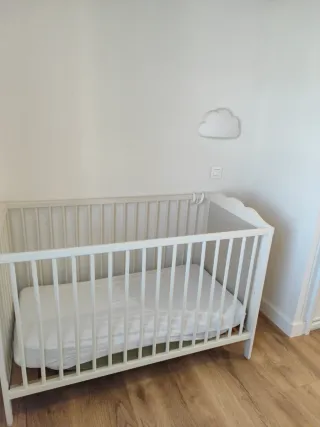 Vendo cuna de Ikea Sundvik con colchon. Esta cuna tiene dos alturas para el colchon y opcion de quitar un lateral (barrotes) para que el niñ@ pueda bajarse solo. Se le puede anadir una barrera de protección de ikea (no inc.). Inc, protector de colchón.