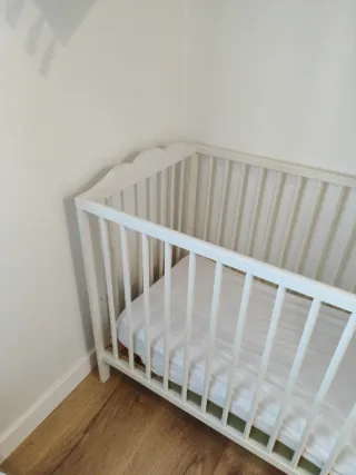 Cuna bebé de madera blanca. 60x120cm. Tiene 3 posiciones de altura de colchón (a medida que el bebé crece vas bajandolo) y un lateral se baja la barra. Se incluye todo lo que se ve. Es que te vas a tu casa y no tienes que pensar en comprar nada mas, ¡paz mental! El colchón es el mejor del mercado 100%. Nuevo cuesta más de 200€. Ecus Care, que previene la plagiocefalia. Incluye: funtas nórdicas Petit Praia (reversible), relleno del nórdico (super calentito), muchas sábanas bajeras, 3 protectores de colchón, el protector de los barrotes (reversible) y los cojines a juego de Petit Praia. La cuña ideal para cuando no respira bien.