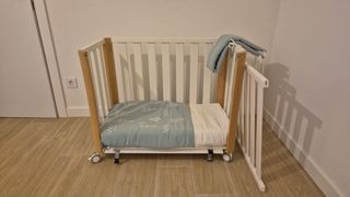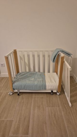 Cuna de colecho con un diseño moderno y funcional. Perfecta para tener al bebé cerca durante la noche. - Estructura de madera lacada en blanco. - Laterales con barrotes. - Patas de madera natural. - Tiene un pequeño desperfecto como se ve en la foto, pero no altera su funcionamiento - posibilidad de ponerle ruedas ( incluidas)