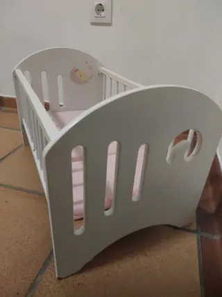 Cuna de bebé en buen estado, lista para su nuevo hogar. Incluye protector de cuna. Incluye también colchón y algunaa sábanas de invierno y verano. - Estructura de madera blanca. - Protector de cuna con estampado de estrellas rosas.
