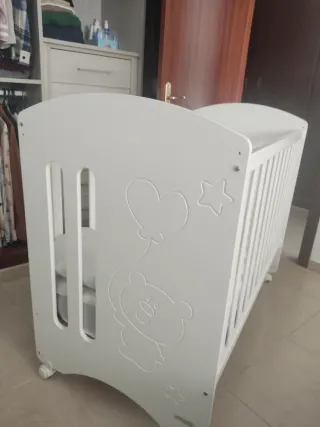 Cuna de bebé en color blanco, lista para usar. - Estructura de madera blanca. - Altura del colchon regulable. - Incluye colchón. - Laterales de barrotes. - Se hace colecho y también puedes poner el otro lateral que se sube y baja.