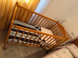 Cuna de madera con un diseño clásico y funcional. Incluye colchón. - Barrera móvil para facilitar el acceso. - Estructura de madera resistente. - Incluye colchón.