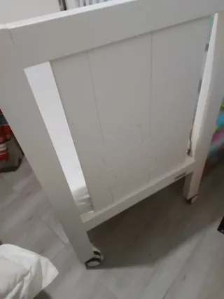 Cuna de colecho en color blanco. - Fabricada íntegramente en madera. - Varias alturas de somier. - 4 ruedas con freno. - Somier multiláminas. - Mordedor en la barra superior de los dos laterales de la cuna. -Un lateral abatible con una sola mano. (fácil, rápido y seguro). -Fácil montaje. - Se incluye colchón My Baby Bertha Plus, de doble cara según los meses del bebé, multiusos con interior de muelles. - No incluye kit de colecho. - En perfecto estado. Se vende porque nos hemos mudado. (costó 273€) No se hacen envíos. Recogida en Entrenúcleos (Dos Hermanas) Por razones laborales, se debe recoger por las tardes o fin de semana.