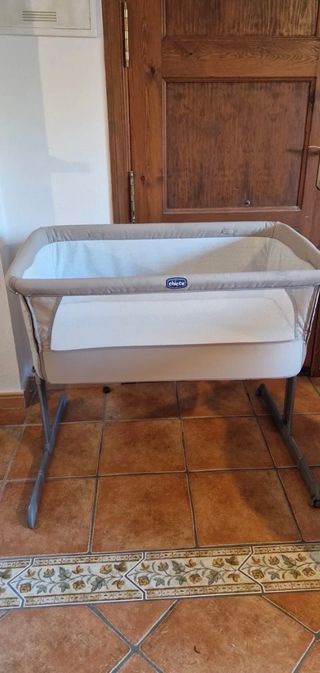 Cuna de colecho de la marca Chicco en color gris. Ideal para tener al bebé cerca durante la noche. - Laterales de malla transpirable. - Estructura metálica. - Ruedas para facilitar el movimiento.