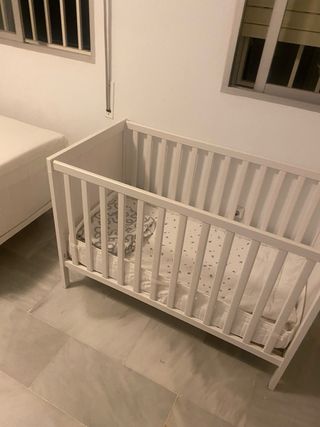 Cuna desmontada lista para montar. Incluye todos los tornillos necesarios para su ensamblaje. - Cuna desmontada. - Tornillos incluidos. - Dos colchones.Cuna desmontada con tornillos + 2 colchones (uno casi nuevo). A recoger urgente en Fuengirola. El lote completo por 120 euros. Por separado, la cama por 70 €. Colchón Ikea 8cm por 15 € (Usado durante 2 años en buen estado, solo necesita un lavado) Colchón de 12 cm por 25 €. (Usar solo 2 veces).