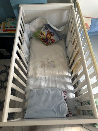 Se vende cuna bebé, el colchón(con lado invierno y el otro verano), chichoneras, edredón, funda y sábanas. Usada más bien conservada, así que está todo en buenas condiciones a parte que se ha perdido una pieza de plástico que no permite tenerla la parte móvil cerrada. La cuna mide 65 cm de ancho, 125 cm de largo y 78 cm de alto. Tiene tres alturas para colchón y se desmonta un lado para pegarla bien a la cama(como hemos siempre utilizada). Tiene 4 ruedas con bloqueo y se monta con 8 tornillos.