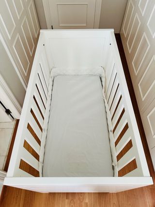 Cuna modelo SUNDVIK de IKEA en color blanco. Sus medidas son 60x120 cm. - Altura: 85 cm. - Ancho: 67 cm. - Profundidad del somier: 21 cm. - Altura del somier: 45 cm. - Espacio entre barrotes: 18 cm.