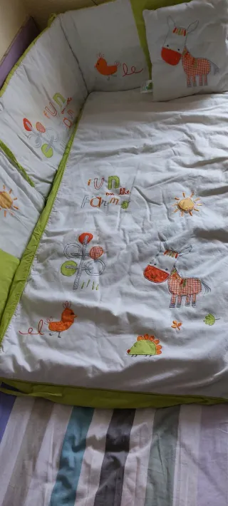 Conjunto de edredón, chichonera y cojín para cuna con un alegre diseño de granja. - Estampado con animales de granja, soles y árboles. - Desenfundable para fácil lavado. - Colores vivos y alegres. - Ideal para decorar la cuna. - Medidas 135 cm x 85 cm - Cojin de 30 cm x 30 cm