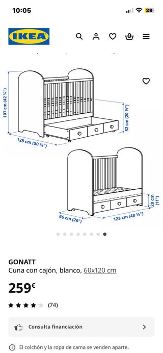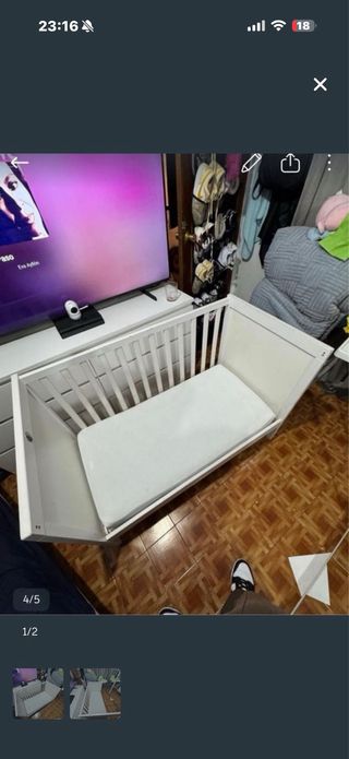 Cuna modelo SUNDVIK de Ikea Con posibilidad de poner el colchón en dos alturas, mas arriba para recién nacido y mas abajo para cuando ya se ponen de pie. Tiene marcas de uso, algún golpe de juguete pero esta como nueva. Se le puede quitar una barrera para usarla como cama La cuna sola por 90€ La cuna con el colchon 190€ Se da prioridad a la venta del conjunto