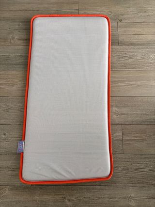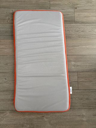 Colchón para cuna de viaje de la marca Ecus. Es ligero y fácil de transportar. - Color gris con ribete naranja. - Textura microperforada. - Bolsa negra para transporte