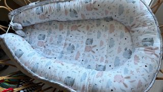 Cuna de colecho con estructura gris y detalles de triángulos negros. - Laterales acolchados. - Interior con estampado de triángulos. Tengo un colchón un poco más pequeño pero que vale perfectamente