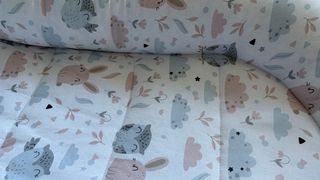 Reductor de cuna con un adorable estampado de animales del bosque, nubes y estrellas en tonos pastel. - Diseño reversible. - Tejido suave y transpirable. - Ideal para crear un nido acogedor para el bebé.