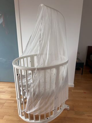 Cuna de bebé de forma ovalada, ideal para habitaciones infantiles. Incluye mosquitera. - Estructura de madera blanca. - Diseño ovalado. - Mosquitera incluida.