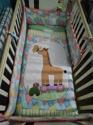 Conjunto de colcha y chichonera para cuna, confeccionado con la técnica patchwork. Presenta un diseño tierno con un jirafa, una tortuga y una mariposa. - Diseño patchwork con motivos infantiles. - Incluye colcha y chichonera. - Chichonera acolchada con estampado de jirafa, tortuga y mariposa. - Colcha a juego con motivos geométricos y de animales. - Colores pastel suaves y alegres. - Chichonera reversible: un lado estampado de colores y otro lado flores en tonos pastel. - Velcro en la parte inferior para poder sacar el forro fácilmente facilitando su lavado. Medidas:120x65x23 ( largo x ancho x alto). El lado que no es completo 65cm