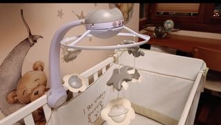 Móvil para cuna con proyecciones de luces y melodías. - Incluye figuras de ositos y estrellas. - Proyecta luces. - Reproduce música.