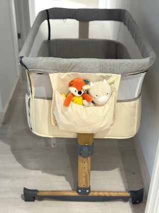 Cuna Jane de colecho, con 6 alturas ajustables. Ideal para tener al bebé cerca. Se vende en mano. Gijón, Asturias. - Color beige y blanco. - Incluye colchón con funda. - Laterales de malla transpirable. - Con ruedas para mover con facilidad.