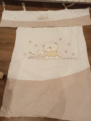 Conjunto de edredón y chichonera para cuna con un tierno diseño de ositos. - Diseño principal con dos ositos y estrellas. - Borde superior con detalle de osito. - Colores neutros en blanco y beige.