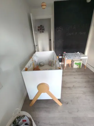 se vende cuna convertible en sofá de juego, tiene ropa de cuna nórdico, almohada. Está muy cuidada y la ropa muy poco usada de la marca Ikea en color blanco - Diseño clásico y funcional. - Barreras de seguridad.