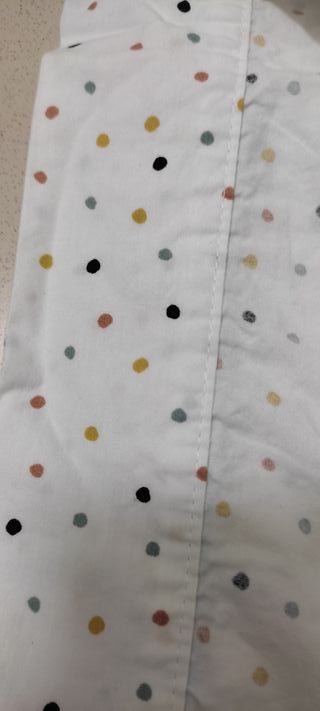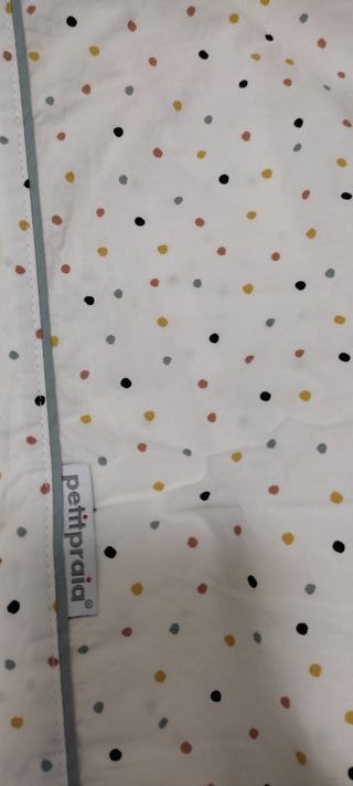 Juego de sábanas para cuna con un divertido estampado de lunares de colores. Incluye sábana bajera, sábana encimera y funda de almohada. - Diseño de lunares multicolor. - Tejido suave y transpirable. - Marca: Petit Praia.