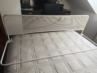 2 Barreras de seguridad para cama, ideal para evitar caídas de los más pequeños durante la noche. Su diseño de malla permite la ventilación y la visibilidad. - Estructura metálica. - Panel de malla. - Color blanco. 135cm la de primera foto y 125eur la de segunda foto. 15 eur cada una y 25eur las dos