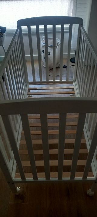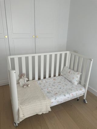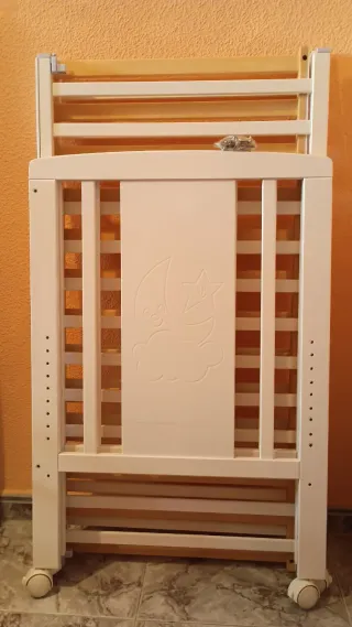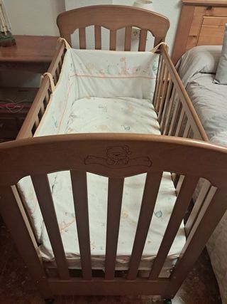 Cuna de bebé en buen estado con estructura de madera, y cuatro ruedas con frenos, apta para bebés de hasta 4-5 años. Incluye colchón, protectores laterales y sábanas. El colchón puede ajustarse a 3 alturas diferentes. Largo: 1,27 m Ancho: 66 cm Alto: 99,5