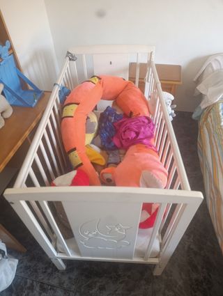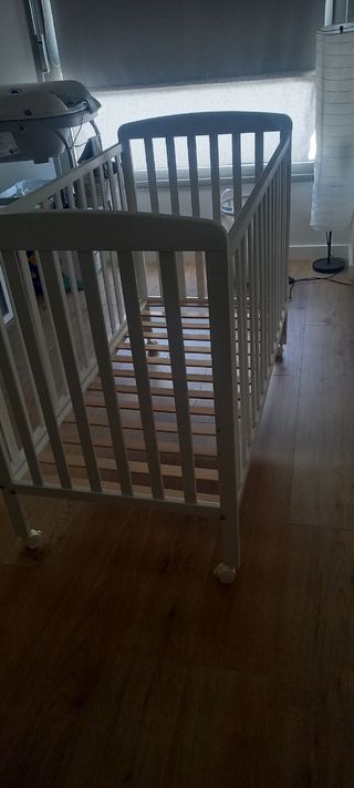 Cuna de colecho con colchón incluido. Ideal para tener al bebé cerca durante la noche. - Estructura de madera blanca. - Colchón con funda, es antiahogo y anti muerte súbida de fibra de coco. Tiene para verano o invierno según posición. - chichonera. Mi hijo ha dormido dos veces si cabe. Perfecto estado. Precio de todo. Posibilidad por separado.