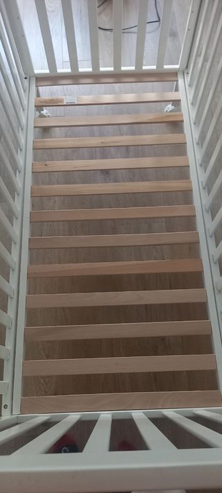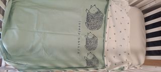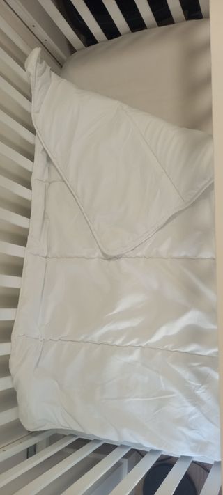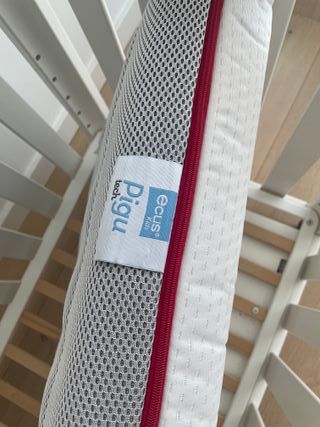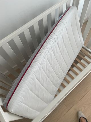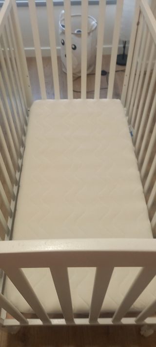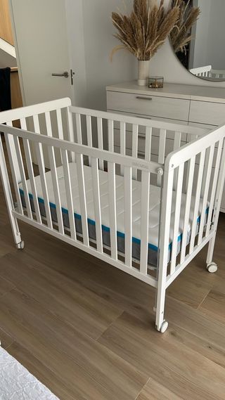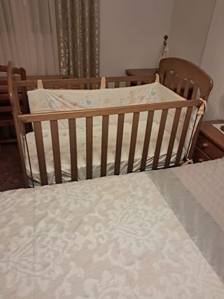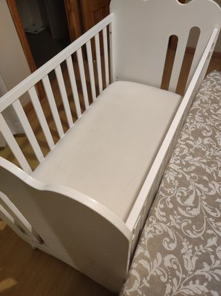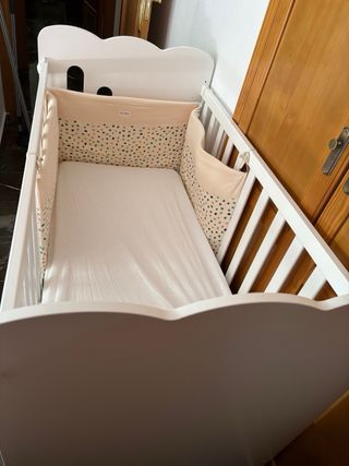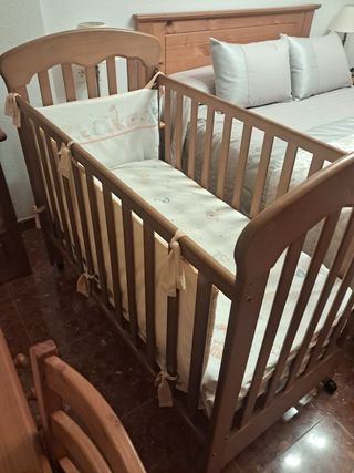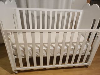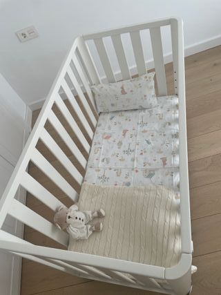 Vendo cuna de 60x120, con 3 alturas para el somier en función de la edad del bebé. Un lateral se baja ligeramente (no colecho). Se vende con el colchón Ecus Kids, con un lado para verano y otro para invierno y funda con cremallera para poder lavar y nórdico ligero con dos fundas (una de ellas reversible) con sistema para evitar que el nórdico se mueva/salga una vez colocado. Cuna y colchón usados durante 2 años; nórdico y fundas solo un par de veces. Muy buen estado.