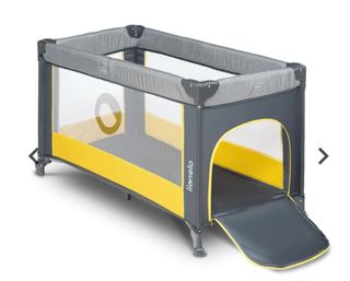 Parque cuna de color gris y amarillo, con laterales de malla y una entrada con cremallera. - Laterales de malla para ventilación. - Entrada con cremallera. - Estructura plegable. -Colchón más dos juegos de sábanas bajeras