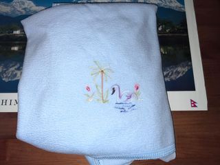 Manta de cuna suave y acogedora con un bonito bordado de cigüeña. - Color: azul claro. - Diseño: cigüeña con bebé y nubes. - Material: tejido suave.