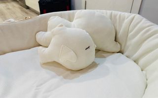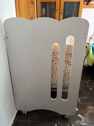 Cuna de la marca Micuna con un diseño infantil de conejito y círculos. Incluye colchón EcusCare. - Estructura blanca. - Dibujo de conejito en relieve. - Ruedas para facilitar el movimiento. - Incluye kit colecho. - Chichonera marca Betribe