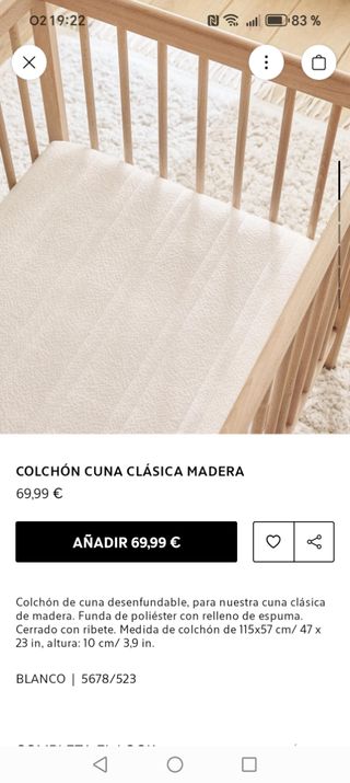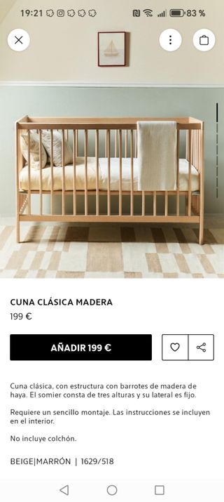 Cuna de bebé en color beige, con un diseño sencillo y funcional. Incluye un cajón para almacenamiento adicional. - Estructura de madera. - Laterales de barrotes. - Cajón inferior - Medidas 60x120cm - Con colchón total de cuna +colchón 35€( colchón nuevo con muy poco uso ya que lo hemos tenido en una segunda residencia y solo íbamos en vacaciones) se puede vender en Granada o en Jaén