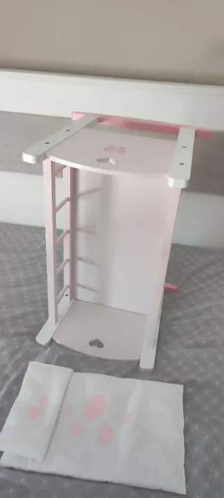 Cuna de viaje de juguete en color rosa, ideal para muñecas. - Estructura de metal y tela. - Laterales de malla transpirable. - Incluye bolsa de transporte.