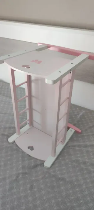 Divertida cuna de juguete para bebés con bañera incorporada. Ideal para juegos de imitación. - Estructura de madera rosa. - Bañera de plástico rosa. - Estante inferior con tela estampada.