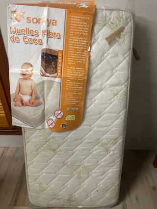 Colchón para cuna de bebé de la marca Soraya, con núcleo de muelles y fibra de coco. - Funda exterior con certificado. - Fibra de coco con certificado Tex. - Carcasa de muelles según norma DIN 17223. - Tratado con Sanitized, un repelente eficaz contra ácaros, domésticos, bacterias y hongos. Se regala cubre colchón impermeable y transpirable Marca Moshy modelo Turia (valorado en 30 €).