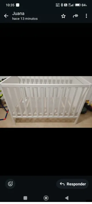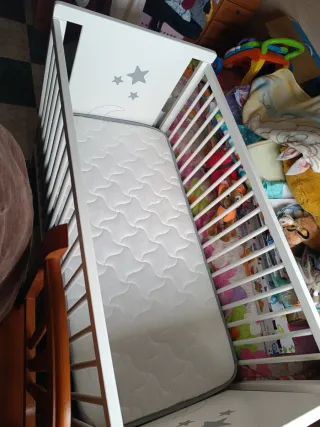 Cuna de madera blanca + colchón - Estructura de madera. - Barreras de seguridad. Los que faltan que aparecen en la foto estaban guardados. Solo los quitamos para que saliera y entrará. Se entrega desmontada. Tiene ruedas que le pusimos nosotros. * Se vende con colchón. Está en perfecto estado. Siempre se ha utilizado con protector impermeable, además del propio protector que trae el colchón