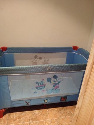 Cuna de viaje de color azul con un divertido diseño de Mickey Mouse y un barco. Con colchon - Laterales de malla transpirable. - Estructura resistente. - Motivos infantiles.