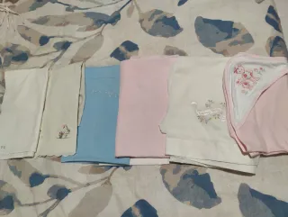 Conjunto de ropa de cuna con varios diseños y colores. - Incluye: *3 fundas de almohada. *6 sábanas encimera. *2 sábanas bajeras. *1 colcha de verano rosa y su correspondiente funda de cojín. *1 colcha blanca y 1 chichonera a juego. *1 mantita rosa de verano. - Tonos pastel y blancos. - Bordados infantiles.