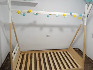 Cama estilo Montessori con estructura de madera. - Diseño de tipi. - Combinación de madera natural y blanco. - Base de listones de madera.