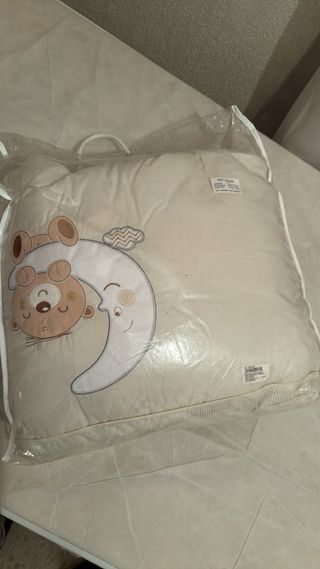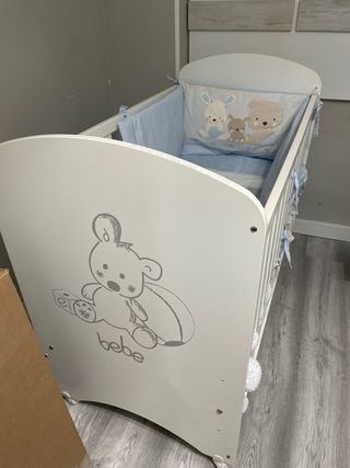 Cuna infantil con un bonito diseño de casitas y árboles. Incluye protector de cuna y colcha. - Protector de cuna con estampado de casitas y árboles. - Colcha con diseño de casa, árbol y ardilla. - Tejido suave y agradable de el corte ingles La cuna 60€ , colchon nuevo 30€ y vestimenta de la cuna 45€