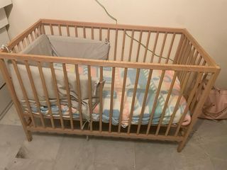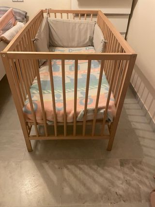 Cuna de madera de IKEA para bebé. Ideal para el descanso del pequeño. - Estructura de madera clara. - Laterales con barrotes. - Incluye colchón y protector de cuna.
