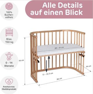 Cuna de madera barnizada Babybay Maxi, ideal como minicuna o cama auxiliar. Ha sido galardonada con la máxima calificación Sehr Gut (1,1) en el test de Warentest Online. - Material: Madera barnizada. - Modelo: Babybay Maxi Beistellbett. - Certificación: GS (Geprüfte Sicherheit). - Garantía del fabricante: 10 años.