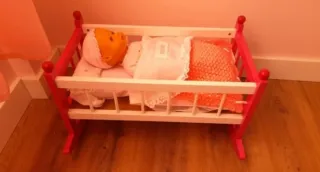 Cuna de juguete para muñecas, ideal para horas de juego. - Estructura de madera con barrotes blancos. - Laterales y base en color rosa. - Incluye manta tejida rosa, colchón con funda, almohada con funda, y sábana bordada a punto de cruz. La ropita está hecha a mano. CON NENUCO 20€ SIN NENUCO 10€