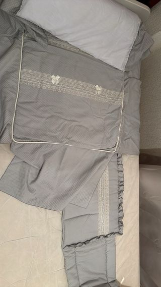 Conjunto de chichonera y funda de cuna en color gris, con detalles de encaje y lazos. - Tejido texturizado. - Ribete blanco. - Adornos de lazos y encaje. 1 no tiene uso, la otra tiene el uso de la cuarentena. Esta nuevo todo. El precio es de las 2 juntas.