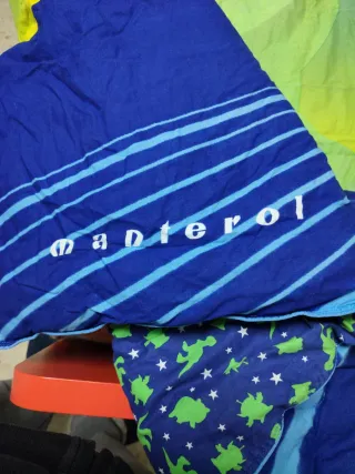 Edredón reversible con diseño de Disney. Por un lado, presenta un fondo azul con rayas en tonos claros y el nombre manterol en blanco. Por el otro lado, tiene un fondo azul marino con estampados de dinosaurios verdes y estrellas blancas. - Diseño reversible. - Personajes de Disney. - Medidas 170x220