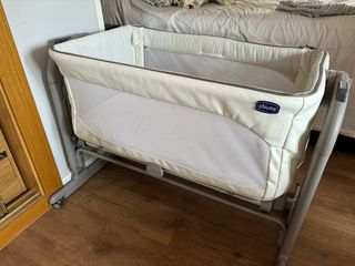 Cuna colecho de la marca Chicco Next2me. Ideal para tener al bebé cerca durante la noche. Se vende montada. - Color blanco y gris. - Laterales de malla transpirable. - Estructura metálica. - Ruedas para facilitar el movimiento.