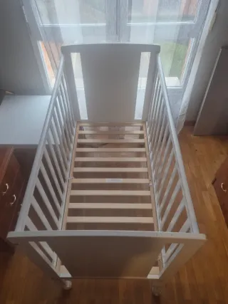 Cuna de niño en muy buen estado, ideal para el descanso del bebé. Su diseño es sencillo y funcional. - Estructura de madera blanca. - Base de somier de láminas. - Incorpora ruedas para facilitar su movilidad.
