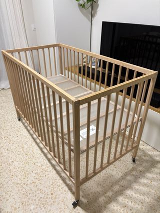 Cuna de madera de IKEA en perfecto estado, ideal para tu bebé. - Medidas: 120x60 cm. - Fabricada en madera. - Incluye ruedas para facilitar su movilidad.
