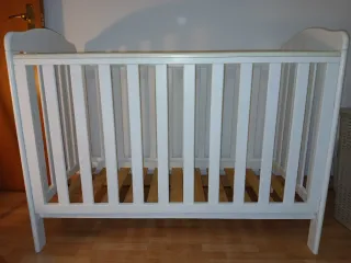 Cuna de madera en color blanco para colchón de 120x60cm. Las medidas de la cuna son: altura 97cm, ancho 67cm, largo 124cm. Fuerte, en perfecto estado, limpia, con algunas marcas del uso que se aprecian en las fotos. -Posibilidad de bajar la baranda o quitar para colecho. -El colchón se puede poner en tres alturas diferentes. -Incluye el protector de cuna en perfecto estado. -Se entrega desmontada.