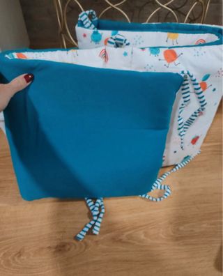 Protector acolchado para cuna con un diseño suave y seguro. - Color azul claro. - Ribete con volantes blancos. - Lazos para atar.