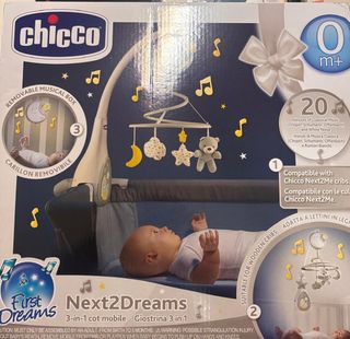 Móvil musical Next2Dreams de Chicco, diseñado para la cuna de tu bebé. Incluye una caja musical extraíble. - 20 minutos de música clásica y ruidos blancos. - Compatible con cunas Chicco Next2Me. - Apto desde el nacimiento hasta los 5 meses.